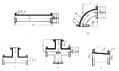 | The product series of steel pipes lined with PP、PE、PVC include straight pipe.pipe fittings of elbow,tee,cross,reducer and etc.Whose external part is flanged steel casing,internal part is plastic liners of PP,PE,PVC and the such,plastic liners are bent on the steel flanges' trimming surface.See following structural drawings: |